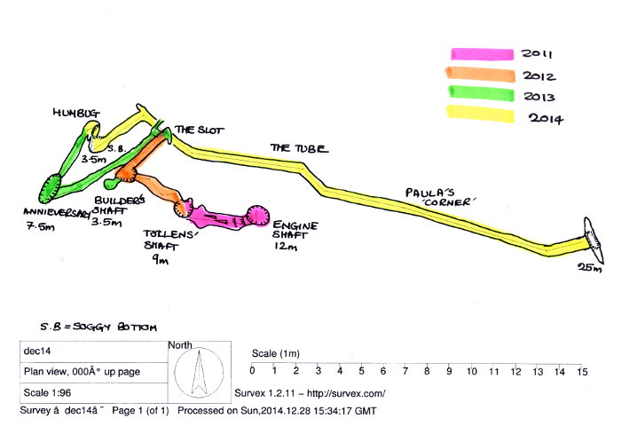 Overall: Another fantastic year ! Good company, good food and good digging. We made a fair amount of passage and the Breakthrough Fairy rewarded us with a couple of pitches. One of these we know only too well; the other was a Christmas present, we have only just unwrapped it and have not tried it on yet.