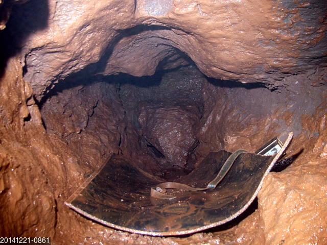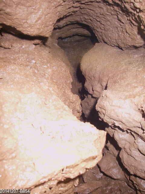 The situation at the end of the dig has changed dramatically, as reported previously (23 November). The photograph shows the approach to the terminal cross-rift. There is the usual unhelpful lack of scale, but it was impossible to get an arm into the trench or a bare head into the upper arched section. However, it was possible to throw rocks at the back wall and some of these would bounce off and fall through an invisible slot in the floor. I had the 'bright' idea to use my cave camera, which has a microphone setting, to record the stone throwing and then process the recording to get accurate timings of the drop. This was not an unqualified success. In the event, the stones bounced, either off ledges or from wall to wall for a total of around 4 seconds before the final faint but deep BOOM !