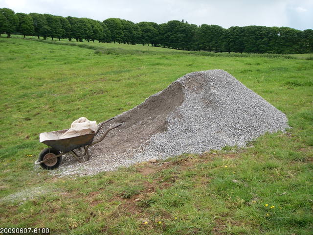 Ignorance is bliss. Certainly is. So we did a lot of preparation and then had a halfbaked attempt at digging under the shaft, because we didn't realise that we were not up to it. When we realised our error, we gave up half-baked digging and went back to more preparation for the rest of the year. Chris Batstone, Jeff Price, Tony Audsley Took bags of rock from Caine Hill and packed them round the top of the shaft to fill the voids there. Chris Batstone, Jeff Price, Tony Audsley Moved the little digging hut towards the centre of the depression to make space for a new digging hut cum engine house. Started laying down a foundation of rock (from Caine Hill) for the new digging hut cum engine-house. Jeff Price, Paul Brock, Tony Audsley About this time desperation was beginning to set in as we tried to find a satisfactory method of stabilising the fill at the bottom of the shaft. Ever game for novelty, we tried out silly idea No. 542. This involved blasting a dry mix of 3:1 sand:cement using compressed air. The idea being to fill the gaps in the spoil with sand/cement, which would the absorb moisture and harden. This worked moderately well, but it also filled the shaft with an unbreathable cloud of cement dust. This is not fun and lacking any form of respirator or dust filter, the attempt was abandoned in favour of sloshing in a wet mix, the Willie Stanton method. No spoil removed. Alice Audsley, Annie Audsley, Roger Galloway, Tony Audsley Kibbles: 1 Bags: 2 The depression was dry, although the new blue drain pipes were taking a very small amount of water. There was a small pool at the bottom of the shaft. Tried drilling into the rock walls, with slightly mixed success. Got three good holes in but when trying to work to the left or the right of these found that solid rock was more that a drill length away. Hauled out two of the bags of fill put down there on 18th July; three more to go. Also hauled out one load of 'proper' spoil. Ivan Sandford, Jeff Price, Tim Large, Tony Audsley Some time ago, Tim had bought a 15 ft long, substantial section I beam from a lady in Blagdon and it seemed that we might find a use for it at the dig. The removal team hauled it out and loaded it onto Ivan's trailer, then drove in convoy to Home Close where it was deposited with the rest of the ironwork at t'hole. We then retired to Hunters' for well earned tea and biscuits. Jeff Price, Tim Large, Tony Audsley Surface preparation work. Dug channels to the drainage sump and filled them with the Belfry gravel. Rain prevented further play, so we retired to Hunters' (Sensible decision). Tony Audsley Took 12 bags of stone chippings from the Belfry car-park to t'hole (thank you to Henry Dawson for this). The depression drainage system seems to be working well and the ground around the yellow sump is drying out and beginning to crack. For those of you who feel tired, jaded and sad, here is an exciting photograph of mud ... drying ... slowly ... Tony Audsley A quick visit to check if the drainage system was working after the torrential day of rain on Tuesday. The depression was draining well and a small amount of water was still running down the pipes. By contrast, the adjacent depression had a 16 inch (or 406mm if you insist) deep pool.