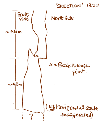Alice Audsley, Jeff Price, Mike Wilson, Stuart Lindsay, Tony Audsley Phil Romford Kibbles: 17 Stuart and Tony were the first to arrive on site and as heavy rain had been forecast, they inserted brand-new hi-tec valves (wine corks) in the blue drain pipes to keep the dig a bit drier. They then went down, Stuart to the bottom of Tollens' Shaft (†) to start capping Tim's boulder, while Tony started excavating the clay fill from the back of the seat alcove at the top of the shaft. A little while later they were joined by Mike and so with Stuart at the bottom loading bags, Mike in the seat alcove unhitching and Tony hauling from the chamber we cleared the remains of the boulder and stacked the bags in the chamber. When the last of the boulder had been cleared, Stuart and Mike went to the surface to haul and Tony loaded the kibble at the bottom of the engine shaft. Altogether 6 kibbles were sent to the surface. Meanwhile, Jeff turned up and Phil Romford paid a brief visit. Lunch time, Alice arrived and Stuart provided bacon butties for all. Thus revived, Stuart and Jeff went to the bottom, Mike sat in the seat, Tony hauled from the chamber and Alice ferried the bags and stacked them at the bottom of the engine shaft. While we were all underground it started to rain very heavily and towards the end of the session hailstones were bouncing off the bags at the bottom of the shaft. At the bottom of Tollens Stuart and Jeff had run out of digging sacks and having cleared the passage somewhat were able to get a better look at the end. This revealed that it did not in fact turn to the left at the end as had previously thought to be the case, but probably continued straight on, but was blocked with rubble as the the roof sloped down to meet the floor. So, having had enough excitement for one day we measured the depth of Tollens as 8.20 metres, then all except Tony went to the surface to haul and tip in the pouring rain, all very invigorating, while Tony stayed below and loaded the kibbles. Altogether, we hauled out a further 11 kibbles. We then removed the hi-tec valves from the pipes and listened to the sound of roaring water at the bottom of the shaft before retiring to the shelter of the tea-room for tea and Genoa cake. _______________ Alice Audsley, Duncan Butler, Mike Wilson, Stuart Lindsay, Tony Audsley Rich Witcombe Kibbles: 7 Initially only Stuart and Tony turned up, so they both went down and Tony started gardening the loose material from the top of the lower shaft whilst being carefully (I hope) lifelined by Stuart. Loose material was removed from the upper right (west) and a heap of jammed rocks from the small aven above. These fell to the floor with a very satisfying series of crashes. Tony then attacked the wall behind where "Tim's boulder" had been and removed an area of thin slabby rock, the remains of the south wall of the vein. A small pebble about 45 × 30 mm containing two visible spots of galena ca. 7 × 7 mm was prised out of the back of this vein. This is the first galena that we have seen. The gardening over and as there was still only the two of us, we decided to start work on enlarging the working area at the top of the drop, with the intention of installing a windlass. Round about now, Mike, Duncan and Alice turned up, but we decided to ignore them and continue with our original plan. Stuart started capping the alcoves at the end of RDR, while Tony took tape and clino readings to try to get a better measure of the true depth of the dig. On the surface, Mike sawed of the excess wood from the door of the tea room to allow it to open fully. Rich Witcombe turned up complete with digging gloves, willing to empty some bags of spoil, but as there was nothing for him to do before he had to leave, he gets classed as a visitor. After a well deserved tea break, Duncan went to the bottom, Stuart to the ledge, Tony to the alcove seat and Alice to the chamber. Thus positioned we hauled and stacked until just after 1700 hrs, when Alice and Tony went to the surface to join Mike and we cleared the backlog of spoil by hauling 7 kibbles. Mike washed up the tea mugs in the bucket of rainwater by the hut only to be told by Stuart "Hey, I used that water to wash the cowsh off my boots". Never mind. We left the site at about 1800 hrs in thick Mendip mist. Mike Wilson, Stuart Lindsay, Tim Large, Tony Audsley Ivan Sandford, Roger Marsh Kibbles: 11.5 Stuart went down first and started capping off the bulge in the wall above the entrance to the lower rift. Ivan Sandford and Roger Marsh then turned up on a visit, so Stuart was left on his own to get on with it while the rest of us chatted on the surface. When the visitors had left, Tony went down with the new underground yellowphone and a coil of telephone cable. This tied itself into a complex series of knots as soon as soon as he let go of it. Tony attempted to cure this by fitting pretty little plastic plugs into the rock wall and attaching the cable to them. This took a long time as follows:- 10% drilling and clipping, 45% untangling and 45% cursing. Eventually he fixed the yellowphone in position in the northern alcove at the top of the pit, then measured up for a stemple to fit over the top of the drop for a hauling pulley. Meanwhile Stuart had finished off a very successful capping session, which might have been less painful for him if had been wearing a cricketers' box about his person. Whatever, we both came out for lunch. After lunch, we made up stemple using a length of steam pipe with an M16 setscrew hammered into one end and an M16 nut hammered into the other end. A length of M16 studding was then screwed into the nut and fitted with a locknut. This completed, all four of us went underground, Tim to the bottom, Stuart to the ledge, then Tony drilled 16mm holes in the rock wall above the pit and fitted the stemple and hauling pulley. We found that it was not possible to haul from the old hauling seat position and a bit awkward for Mike to ha