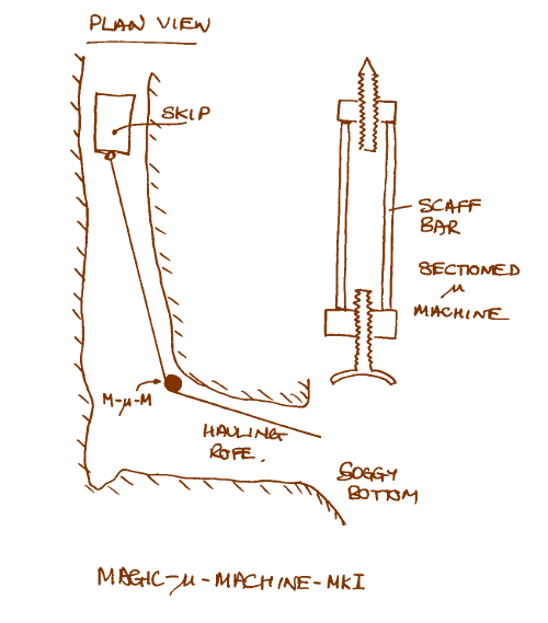 We soon got to work and stuffed the spare conveyor belt in a bag, and with Sam going ahead, I followed rolling the bag along the Tube. Small puddles of fine sandy silt were a sign that the stream level had recently been higher. Sam crawled to the end of the existing conveyor and dragged it up to Paula's Corner. I'm not quite agile enough to turn around in the wide part of the tube so passing Sam, I crawled to the end for a quick look while Sam rolled out the new piece of conveyor back toward Soggy B. The end of the belt now stops about 4 Metres short of the sharp end and 5 Metres short of the bend at Soggy B. We made our way back to Soggy B and assembled the friction reducer on the corner of the bend where the skip rope tends to rub. A bit of chiselling to seat the foot of the device and some more cut into the roof for the pointy end. A few turns with the spanner and the job appears to be a "good un". All this whilst the stream found its way up my left leg and out of my left sleeve then into Sam's right sleeve and out via his right leg. Not wishing to wallow any longer we beat a retreat to the surface, stopping to recover the phone from the bottom of the Builders Ladder. Back on surface after approximately 2 hrs. "Doesn't time fly when you are having fun". The surface team returned from their perambulations shortly after we surfaced, to partake in tea and stickies. ![]() A bit about the friction device The friction reducing device, or the 'Magic-Mu-Machine-MkI' was a short length of scaffold pole which had been 'stempleized' by the addition of lengths of 25mm threaded bar and matching nuts at the top and the bottom. It was then mounted vertically between the roof and floor of the Tube at the first corner as described by Chris. See diagram below. Incidentally, there is a MkII Magic-μ-Machine complete with roller being made, but we'll see how we get on with this one first. ![]() ![]() Lots of snuffling and wimpery, but no digging. Alice Audsley, Caroline Allen, Chris Batstone, Ian Gregory (Slug), Les Oxborough, Nick Gymer, Paul Brock, Paul Clayton, Rose Clayton, Rupert Fear, Tony Audsley Bags: 76 In case you missed it, that's SEVENTY SIX bags ! A fine day and a very fine team. Caroline, Paul and Tony started it off with an early breakfast at the Priddy Good Farm Shop which set them up for the day. The team was bigger than usual; Nick and Ian had been to the BEC dinner yesterday evening and were in need of gentle exercise, Les came over because as he said, "I couldn't think of anything better to do" and Paul C. and Rose were on a 'taster session' to see what the digging was like. The rest of us were there I suppose because we couldn't think of anything better to do either. Paul and Caroline started clearing back from Paula's Corner and had done the vast majority of this before being joined by the rest of the underground team and the long process of transporting the bags to the surface began. It was a heavy session but seventy six bags made it to grass, which cleared the dig of all spoil except three modest boulders left in Soggy Bottom - where they form a useful step. Back on the surface, the feeding frenzy was enhanced by Slug's contribution of bread pudding, a major ingredient of which seemed to be Jack Daniel's whiskey; very tasty.