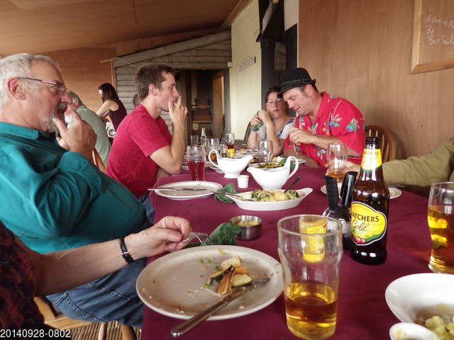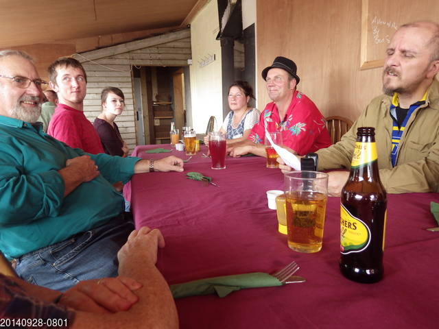[As ever, strict adherence to the facts can spoil a good story]. Alice Audsley, Caroline Allen, Chris Batstone, Paul Brock, Sam Batstone, Tony Audsley Caroline, Paul and Tony started off with a breakfast at Priddy Good Farm Shop, which included slices of black pudding at least 4½ cm thick. We had a bit of a slow start after this but it was worth it. There was no spoil to remove from the dig, only a ritual offering to be made to the Goddess, so Chris thought that a bit of filming would be in order. The main idea was to set up the camera and lights as close as possible to the end, pointing outbye, then film the drilling from the sharp end. This involved lots of too-ing and fro-ing and repeated swappings of position for two of the least sylph-like members of the team. Not easy in the tube, but hopefully worth the struggle. Thereafter, 8-fold offerings were made to the Goddess in the hope that she would dole us out a bit more passage in return. It would also be good (are you listening Goddess ?) to have some working space in the region of the corner. We will need this in the future as it is likely to become a hauling stance. Elsewhere in the cave, Chris and Sam did some more filming in Annieversary and Paul attacked the ascending rift in the roof of Humbug Hall, before coming to the end to the tube to help clear the kit. We finished off with sausage rolls, flap-jacks and falaffals with chilli and raita dips, then some much needed rehydration. Alice Audsley, Chris Batstone, Tony Audsley More surface fettling. Amongst other things, repairs and alterations to Les' "Chicken-House" store. I won't inflict the details of this on you, as you have probably suffered enough from last Saturday's 'much ado about nothing' account. Although, talking about that, the fix to the leaking roof of the T-room does appear to have been successful and the interior was dry and snug after the heavy rain on Friday night. Alice Audsley, Caroline Allen, Chris Batstone, Louise Jenkins, Paul Brock, Paul Clayton, Rose Clayton, Rupert Fear, Sam Batstone, Tony Audsley The Soggy Bottom Crew's outing for Sunday roast at the Priddy Good Farm Shop. Fantastic. Alice Audsley, Chris Batstone, Tony Audsley Louise Jenkins, Rupert Fear, Sam Batstone The plan today was to do some surface fettling, in preparation for winter. The major item was to fix the leaking roof of the T-room, which had been an annoyance since the dawn of time. We had been vowing to fix it since then, but as ever ; 'there is no time like tomorrow ...' Having bitten the bullet, there was no need for a large and powerful team, so Paul, Caroline and Nick were given day-release passes and allowed to play elsewhere. There is not much (any?) point in going into a great amount of detail but in essence we removed the wriggly tin from the T-room roof, covered the boards with roofing felt dosed with an appreciable amount of sticky felt-goo then replaced the wriggly tin. The felt-goo was wonderfully all-pervading as Chris found when he got a very large patch on the seat of his new-ish jeans. He had to go to the pub wearing a boiler-suit. We were visited in the afternoon by Lou and Sam, who had been carpet-hunting and by Rupert (still excused from digging), who turned up with edible goodies. Why Saturday working ? (A): it's never a good idea to be too predictable, but mainly (B): we had arranged to have a Sunday roast tomorrow at the Priddy Good Farm Shop and I defy anybody to much work with one of those inside them. Alice Audsley, Caroline Allen, Chris Batstone, Paul Brock, Sam Batstone, Tony Audsley Arthur the terrier (Chris called him 'Arfer' because he arfed a lot). Rupert Fear - attended the breakfast and the aprés-dig rehydration ceremony, but missed the middle bit. The original plan had been somewhat different, but events decreed otherwise. So, after a huge breakfast at the Priddy Good Farm Shop and a bit of surface clearance work at the dig, Alice, Arthur, Caroline, Paul and Tony walked from there to Greendown and back, while HEROES Chris and Sam went to work underground. Chris' report follows:- Chris and Sam descended to Soggy Bottom carrying a rather weighty tackle sack containing the iron mongery for the friction reducer. The rainfall from the previous week has now percolated through making the bottom of Annieversary and Soggy Bottom rather unpleasant places to hang about.
