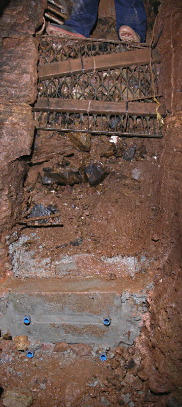 The metal grid fits quite tidily into the recess which does require a little more spoil removal to achieve the desired position. A number of larger rocks need to be removed carefully so as not to disturb the underpinning of the concrete shaft base. Once the wall is completed it should not be too difficult to cast a reinforced underpinning. It was all over just after 21:00.