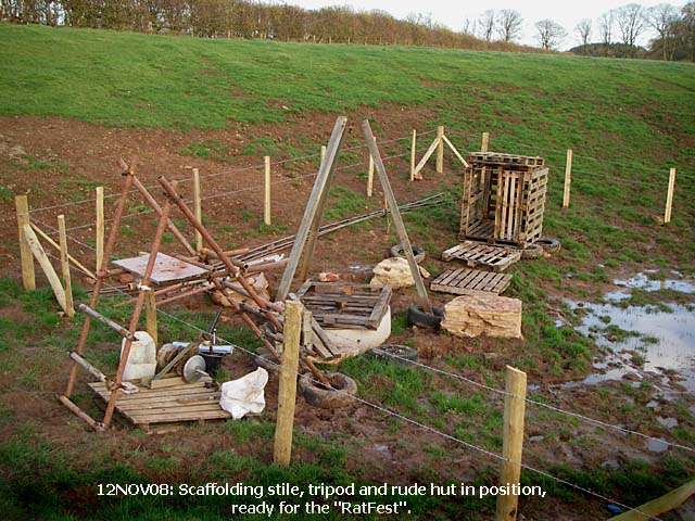 12NOV08: Scaffolding stile, tripod and rude hut in position in time for the 'RatFest'. |